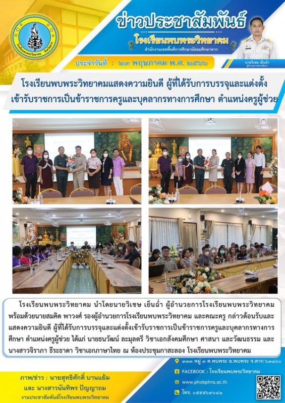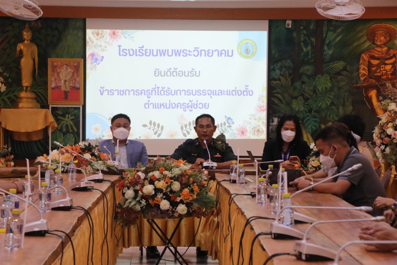 โรงเรียนพบพระวิทยาคม นำโดยนายวิเชษ เย็นฉ่ำ ผู้อำนวยการโรงเรียนพบพระวิทยาคม พร้อมด้วยนายสมคิด พาวงศ์ รองผู้อำนวยการโรงเรียนพบพระวิทยาคม และคณะครู กล่าวต้อนรับและแสดงความยินดี ผู้ที่ได้รับการบรรจุและแต่งตั้งเข้ารับราชการเป็นข้าราชการครูและบุคลากรทางการศึกษา ตำแหน่งครูผู้ช่วย ได้แก่ นายธนวัฒน์ ละมุลตรี วิชาเอกสังคมศึกษา ศาสนา และวัฒนธรรม และนางสาวจิราภา ธีระธาดา วิชาเอกภาษาไทย ณ ห้องประชุมกาสะลอง โรงเรียนพบพระวิทยาคม |