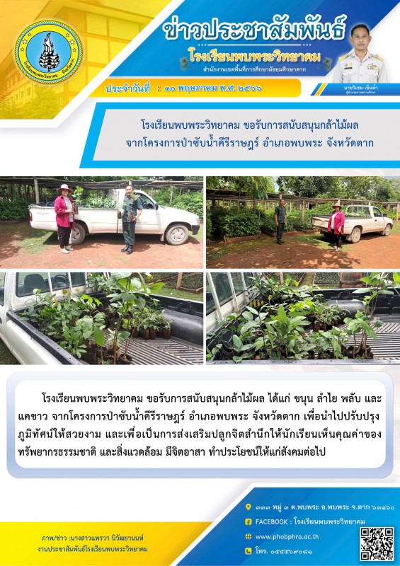 โรงเรียนพบพระวิทยาคม ขอรับการสนับสนุนกล้าไม้ผล ได้แก่ ขนุน ลำไย พลับ และแคขาว จากโครงการป่าซับน้ำคีรีราษฎร์ อำเภอพบพระ จังหวัดตาก เพื่อนำไปปรับปรุง ภูมิทัศน์ให้สวยงาม และเพื่อเป็นการส่งเสริมปลูกจิตสำนึกให้นักเรียนเห็นคุณค่าของทรัพยากรธรรมชาติ และสิ่งแวดล้อม มีจิตอาสา ทำประโยชน์ให้แก่สังคมต่อไป |