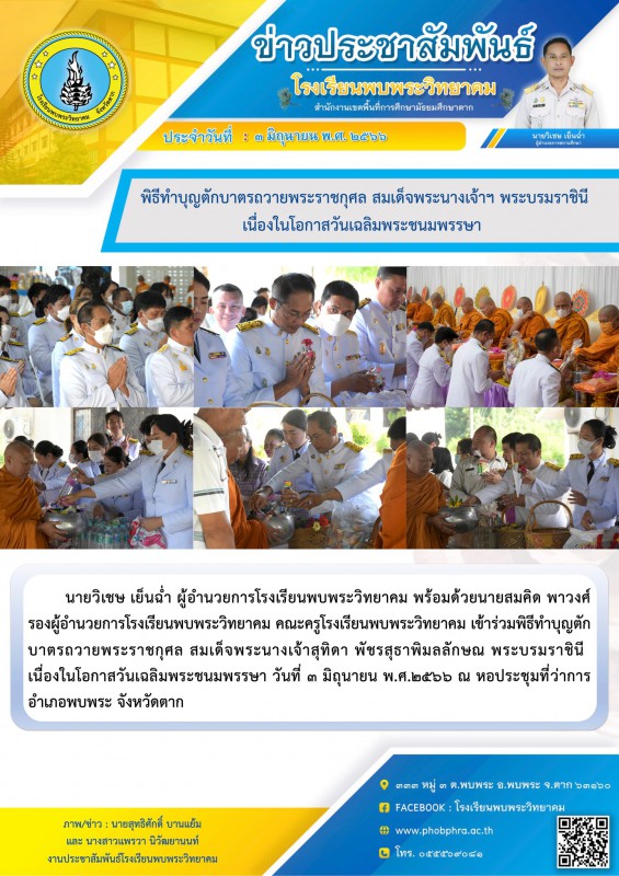นายวิเชษ เย็นฉ่ำ ผู้อำนวยการโรงเรียนพบพระวิทยาคม พร้อมด้วยนายสมคิด พาวงศ์ รองผู้อำนวยการโรงเรียนพบพระวิทยาคม คณะครูโรงเรียนพบพระวิทยาคม เข้าร่วมพิธีทำบุญตักบาตรถวายพระราชกุศล สมเด็จพระนางเจ้าสุทิดา พัชรสุธาพิมลลักษณ พระบรมราชินี เนื่องในโอกาสวันเฉลิมพระชนมพรรษา วันที่ ๓ มิถุนายน พ.ศ.๒๕๖๖ ณ หอประชุมที่ว่าการอำเภอพบพระ จังหวัดตาก |