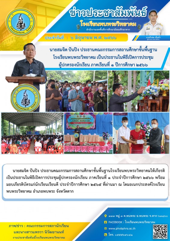 นายสมจิต ปันปิง ประธานคณะกรรมการสถานศึกษาขั้นพื้นฐานโรงเรียนพบพระวิทยาคมให้เกียรติเป็นประธานในพิธีเปิดการประชุมผู้ปกครองนักเรียน ภาคเรียนที่ ๑ ประจำปีการศึกษา ๒๕๖๖ พร้อมมอบเกียรติบัตรแก่นักเรียนเรียนดี ประจำปีการศึกษา ๒๕๖๕ ที่ผ่านมา ณ โดมอเนกประสงค์ โรงเรียนพบพระวิทยาคม อำเภอพบพระ จังหวัดตาก |
