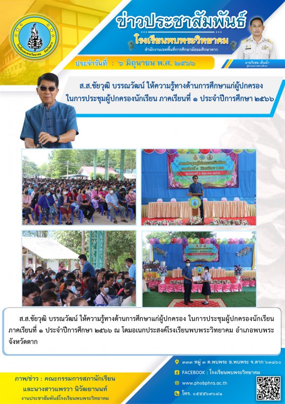 ส.ส.ชัยวุฒิ บรรณวัฒน์ ให้ความรู้ทางด้านการศึกษาแก่ผู้ปกครอง ในการประชุมผู้ปกครองนักเรียนภาคเรียนที่ ๑ ประจำปีการศึกษา ๒๕๖๖ ณ โดมอเนกประสงค์ โรงเรียนพบพระวิทยาคม อำเภอพบพระ จังหวัดตาก |
