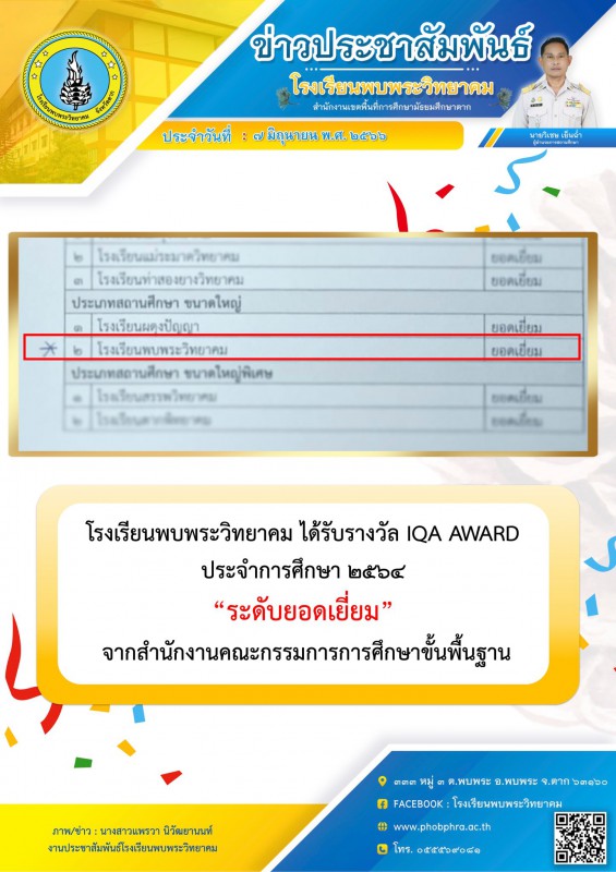 โรงเรียนพบพระวิทยาคม ได้รับรางวัล IQA AWARD ประจำการศึกษา ๒๕๖๔ “ระดับยอดเยี่ยม” จากสำนักงานคณะกรรมการการศึกษาขั้นพื้นฐาน