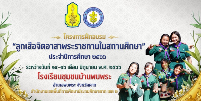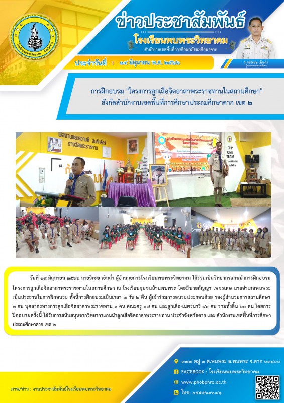 วันที่ ๑๔ มิถุนายน ๒๕๖๖ นายวิเชษ เย็นฉ่ำ ผู้อํานวยการโรงเรียนพบพระวิทยาคม ได้ร่วมเป็นวิทยากรแกนนําการฝึกอบรม โครงการลูกเสือจิตอาสาพระราชทานในสถานศึกษา ณ โรงเรียนชุมชนบ้านพบพระ โดยมีนายสัญญา เพชรเศษ นายอําเภอพบพระ เป็นประธานในการฝึกอบรม ทั้งนี้การฝึกอบรมเป็นเวลา ๓ วัน ๒ คืน ผู้เข้าร่วมการอบรมประกอบด้วย รองผู้อํานวยการสถานศึกษา ๒ คน บุคลากรทางการลูกเสือจิตอาสาพระราชทาน ๑ คน คณะครู ๑๗ คน และลูกเสือ-เนตรนารี ๔๐ คน รวมทั้งสิ้น ๖๐ คน โดยการ ฝึกอบรมครั้งนี้ ได้รับการสนับสนุนจากวิทยากรแกนนําลูกเสือจิตอาสาพระราชทาน ประจําจังหวัดตาก และ สํานักงานเขตพื้นที่การศึกษา ประถมศึกษาตาก เขต ๒