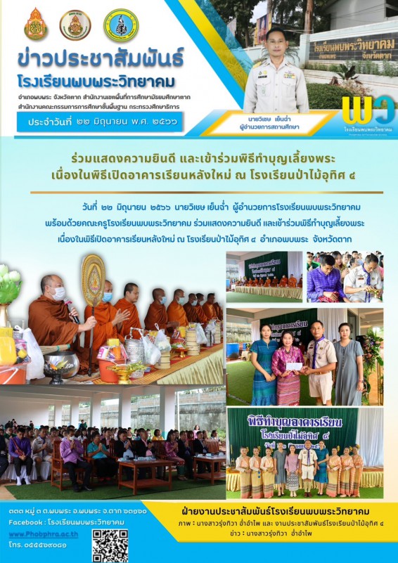วันที่ ๒๒ มิถุนายน ๒๕๖๖ นายวิเชษ เย็นฉ่ํา ผู้อํานวยการโรงเรียนพบพระวิทยาคม พร้อมด้วยคณะครูโรงเรียนพบพระวิทยาคม ร่วมแสดงความยินดี และเข้าร่วมพิธีทําบุญเลี้ยงพระ เนื่องในพิธีเปิดอาคารเรียนหลังใหม่ ณ โรงเรียนป่าไม้อุทิศ ๔ อําเภอพบพระ จังหวัดตาก