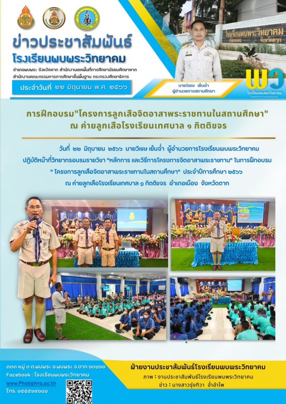 วันที่ ๒๒ มิถุนายน ๒๕๖๖ นายวิเชษ เย็นฉ่ํา ผู้อํานวยการโรงเรียนพบพระวิทยาคม ปฏิบัติหน้าที่วิทยากรอบรมรายวิชา "หลักการ และวิธีการโครงการจิตอาสาพระราชทาน" ในการฝึกอบรม " โครงการลูกเสือจิตอาสาพระราชทานในสถานศึกษา" ประจําปีการศึกษา ๒๕๖๖ ณ ค่ายลูกเสือโรงเรียนเทศบาล ๑ กิตติขจร อําเภอเมือง จังหวัดตาก