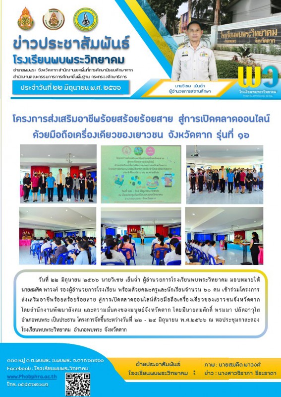 วันที่ ๒๒ มิถุนายน ๒๕๖๖ นายวิเชษ เย็นฉ่ํา ผู้อํานวยการโรงเรียนพบพระวิทยาคม มอบหมายให้ นายสมคิด พาวงศ์ รองผู้อํานวยการโรงเรียน พร้อมด้วยคณะครูและนักเรียนจํานวน 50 คน เข้าร่วมโครงการ ส่งเสริมอาชีพร้อยสร้อยร้อยสาย สู่การเปิดตลาดออนไลน์ด้วยมือถือเครื่องเดียวของเยาวชนจังหวัดตาก โดยสํานักงานพัฒนาสังคม และความมั่นคงของมนุษย์จังหวัดตาก โดยมีนายสมศักดิ์ พรมมา ปลัดอาวุโส อําาเภอพบพระ เป็นประธาน โครงการจัดขึ้นระหว่างวันที่ ๒๒ - ๒๔ มิถุนายน พ.ศ.๒๕๖๖ ณ หอประชุมกาสะลอง โรงเรียนพบพระวิทยาคม อําเภอพบพระ จังหวัดตาก