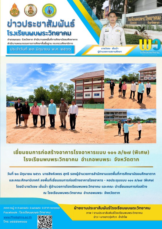 วันที่ ๒๓ มิถุนายน ๒๕๖๖ นายสิงห์เพชร สุทธิ รองผู้อํานวยการสํานักงานเขตพื้นที่การศึกษามัธยมศึกษาตาก และคณะศึกษานิเทศก์ ลงพื้นที่เยี่ยมชมการก่อสร้างอาคารโรงอาหาร - หอประชุมแบบ 909 a/๒๗ (พิเศษ) โดยมี นายวิเชษ เย็นฉ่ํา ผู้อํานวยการโรงเรียนพบพระวิทยาคม และคณะ นําเยี่ยมชมการก่อสร้างณ โรงเรียนพบพระวิทยาคม อําเภอพบพระ จังหวัดตาก