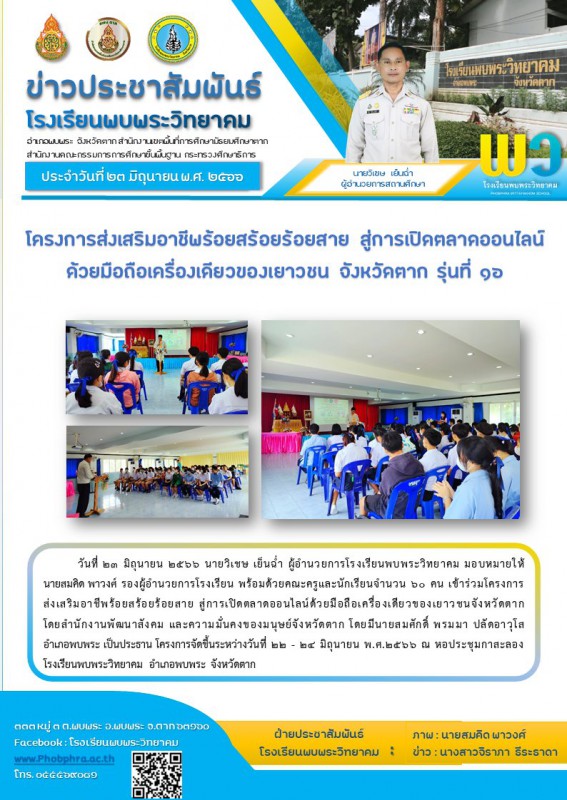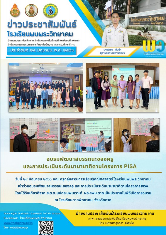 วันที่ ๒๔ มิถุนายน ๒๕๖๖ คณะครูกลุ่มสาระการเรียนรู้คณิตศาสตร์ โรงเรียนพบพระวิทยาคม เข้าร่วมอบรมพัฒนาสมรรถนะของครู และการประเมินระดับนานาชาติตามโครงการ PISA โดยได้รับเกียรติจาก ส.ต.ต. นปดล นพเคราะห์ ผอ.สพม.ตาก เป็นประธานในพิธีเปิดการอบรม ณ โรงเรียนตากพิทยาคม จังหวัดตาก |