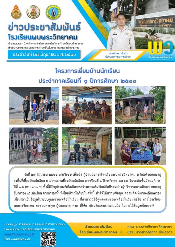 วันที่ ๒๗ มิถุนายน ๒๕๖๖ นายวิเชษ เย็นฉ่ำ ผู้อํานวยการโรงเรียนพบพระวิทยาคม พร้อมด้วยคณะครู ลงพื้นที่เยี่ยมบ้านนักเรียน ตามโครงการเยี่ยมบ้านนักเรียน ภาคเรียนที่ ๑ ปีการศึกษา ๒๕๖๖ ในระดับชั้นมัธยมศึกษา ปีที่ ๑-๖ ครบ ๑๐๐ % ทั้งนี้มีวัตถุประสงค์เพื่อเป็นการสร้างความสัมพันธ์อันดีระหว่างผู้บริหารสถานศึกษา คณะครู ผู้ปกครอง และนักเรียน จากการลงพื้นที่เยี่ยมบ้านนักเรียนในครั้งนี้ ทําให้ได้ทราบข้อมูล ความคิดเห็นของผู้ปกครอง เพื่อนํามาเป็นข้อมูลในระบบดูแลช่วยเหลือนักเรียน ที่สามารถใช้ดูแลและช่วยเหลือนักเรียนต่อไป ทางโรงเรียน พบพระวิทยาคม ขอขอบพระคุณ ผู้ปกครองทุกท่าน ที่ให้การต้อนรับและความร่วมมือ ในการให้ข้อมูลเป็นอย่างดี