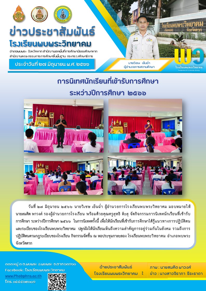 วันที่ ๒๗ มิถุนายน ๒๕๖๖ นายวิเชษ เย็นฉ่ำ ผู้อํานวยการโรงเรียนพบพระวิทยาคม มอบหมายให้ นายสมคิด พาวงศ์ รองผู้อํานวยการโรงเรียน พร้อมด้วยคุณครูสุทธิ ต๊ะสุ จัดกิจกรรมการนิเทศนักเรียนที่เข้ารับ การศึกษา ระหว่างปีการศึกษา ๒๕๖๖ ในการนิเทศครั้งนี้ เพื่อให้นักเรียนที่เข้ารับการศึกษาได้รู้แนวทางการปฏิบัติตน และระเบียบของโรงเรียนพบพระวิทยาคม ปลูกฝังให้นักเรียนเห็นถึงความสําคัญการอยู่ร่วมกันในสังคม รวมถึงการ ปฏิบัติตนตามกฎระเบียบของโรงเรียน กิจกรรมจัดขึ้น ณ หอประชุมกาสะลอง โรงเรียนพบพระวิทยาคม อําเภอพบพระ