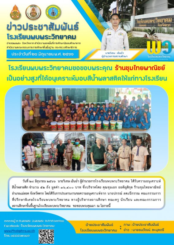 28 มิ.ย. 66 โรงเรียนพบพระวิทยาคมขอขอบพระคุณ ร้านชุมไทยพาณิชย์ เป็นอย่างสูงที่ได้อนุเคราะห์มอบสีน้ําพลาสติคให้แก่ทางโรงเรียน