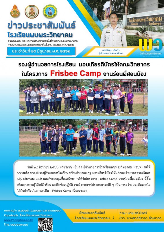 วันที่ ๒๙ มิถุนายน ๒๕๖๖ นายวิเชษ เย็นฉ่ำ ผู้อํานวยการโรงเรียนพบพระวิทยาคม มอบหมายให้ นายสมคิด พาวงศ์ รองผู้อํานวยการโรงเรียน พร้อมด้วยคณะครู มอบเกียรติบัตรให้แก่คณะวิทยากรจากสโมสร Sky Ultimate Club แทนคําขอบคุณที่คณะวิทยากรได้จัดโครงการ Frisbee Camp จานร่อนพี่สอนน้อง นี้ขึ้น เพื่อมอบความรู้ให้แก่นักเรียน และฝึกซ้อมปฏิบัติ รวมถึงการแชร์ประสบการณ์ดี ๆ เป็นการสร้างแรงบันดาลใจ ให้กับนักเรียนในการเล่นกีฬา Frisbee Camp เป็นอย่างมาก