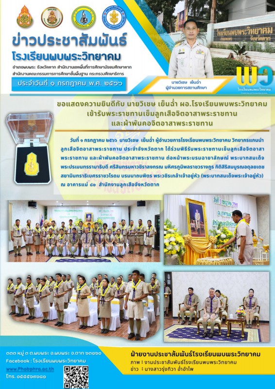 1 ก.ค. 66 ขอแสดงความยินดีกับ นายวิเชษ เย็นฉ่ำ ผ.อ.โรงเรียนพบพระวิทยาคม เข้ารับพระราชทานเข็มลูกเสือและผ้าพันคอจิตอาสาพระราชทาน