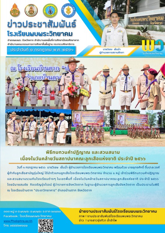 วันที่ ๑ กรกฎาคม ๒๕๖๖ นายวิเชษ เย็นฉ่ำ ผู้อำนวยการโรงเรียน พร้อมด้วย นายยุทธศักดิ์ ติ๊บปะละวงศ์ ผู้กำกับลูกเสือสามัญรุ่นใหญ่ ได้นำตัวแทนลูกเสือ จำนวน ๑ หมู่ เข้าร่วมพิธีทบทวนคำปฏิญาณและสวนสนาม เนื่องในวันคล้ายวันสถาปนาคณะลูกเสือแห่งชาติ ประจำปี ๒๕๖๖ |