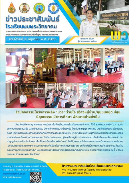 วันที่ ๒ กรกฎาคม ๒๕๖๖ นายวิเชษ เย็นฉ่ำ ผู้อำนวยการโรงเรียน เข้าร่วมกิจกรรมโครงการพลัง "บวร" ร่วมใจสร้างหมู่บ้าน/ชุมชนอยู่ดี มีสุข มีคุณธรรมนำการศึกษา พัฒนาอย่างยั่งยืน ณ วัดราษฎร์เจริญธรรม หมู่ที่ ๖ ตำบลช่องแคบ อำเภอพบพระ จังหวัดตาก |