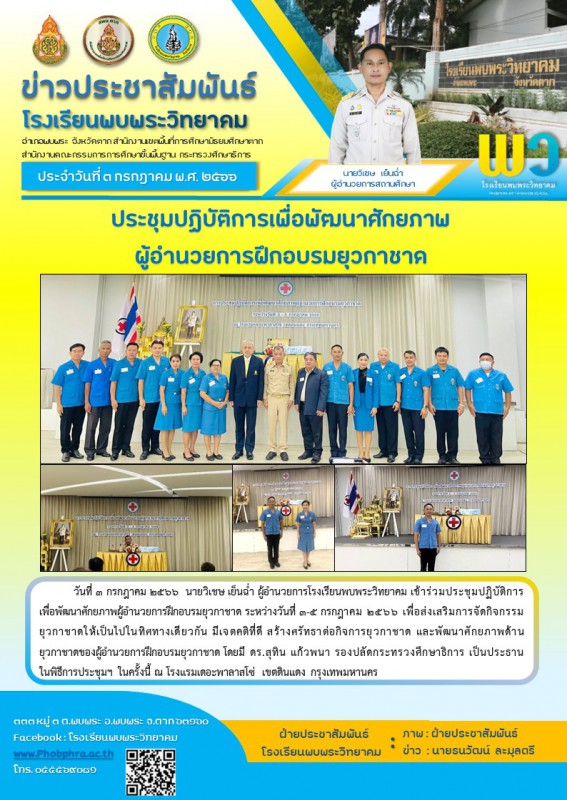 ๓ กรกฎาคม ๒๕๖๖ นายวิเชษ เย็นฉ่ำ ผู้อำนวยการโรงเรียน เข้าร่วมประชุมปฏิบัติการเพื่อพัฒนาศักยภาพผู้อำนวยการฝึกอบรมยุวกาชาด ระหว่างวันที่ ๓-๕ กรกฎาคม ๒๕๖๖ เพื่อส่งเสริมการจัดกิจกรรมยุวกาชาดให้เป็นไปในทิศทางเดียวกัน มีเจตคติที่ดี สร้างศรัทธาต่อกิจการยุวกาชาด และพัฒนาศักยภาพด้านยุวกาชาดของผู้อำนวยการฝึกอบรมยุวกาชาด |