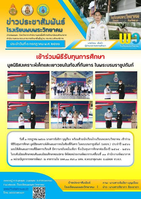 วันที่ ๓ กรกฎาคม ๒๕๖๖ นางสาวจันจิรา บุญเรือง พร้อมด้วยนักเรียนโรงเรียนพบพระวิทยาคม เข้าร่วมพิธีรับทุนการศึกษา มูลนิธิสงเคราะห์เด็กและเยาชนในท้องที่กันดาร ในพระบรมราชูปถัมภ์ (มสยช.) ประจำปี ๒๕๖๖ |