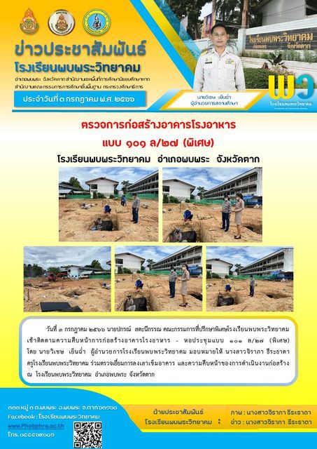 วันที่ ๓ กรกฎาคม ๒๕๖๖ นายปกรณ์ สตะนีกรรณ คณะกรรมการที่ปรึกษาพิเศษโรงเรียนพบพระวิทยาคม เข้าติดตามความคืบหน้าการก่อสร้างอาคารโรงอาหาร แบบ 101ล/27 (พิเศษ) |