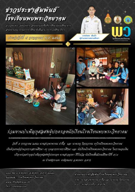 วันที่ ๕ กรกฎาคม ๒๕๖๖ นางสาวพรพรรณ คำตื้อ และนางเรณู กิจกวรรณ ครูโรงเรียนพบพระวิทยาคม เป็นตัวแทนผู้บริหารสถานศึกษา ครู บุคลากรทางการศึกษา และนักเรียนโรงเรียนพบพระวิทยาคม ในการมอบเงินร่วมทำบุญบำเพ็ญกุศลศพผู้ปกครอง ณ บ้านซอระแตะ ตำบลช่องแคบ อำเภอพบพระ จังหวัดตาก |