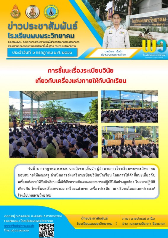 วันที่ ๖ กรกฎาคม ๒๕๖๖ นายวิเชษ เย็นฉ่ำ ผู้อำนวยการโรงเรียนพบพระวิทยาคม มอบหมายให้คณะครู ดำเนินการส่งเสริมระเบียบวินัยนักเรียน โดยการชี้แนะเกี่ยวกับเครื่องแต่งกายให้กับนักเรียน เพื่อให้เกิดความชัดเจนและสามารถปฏิบติได้อย่างถูกต้อง |