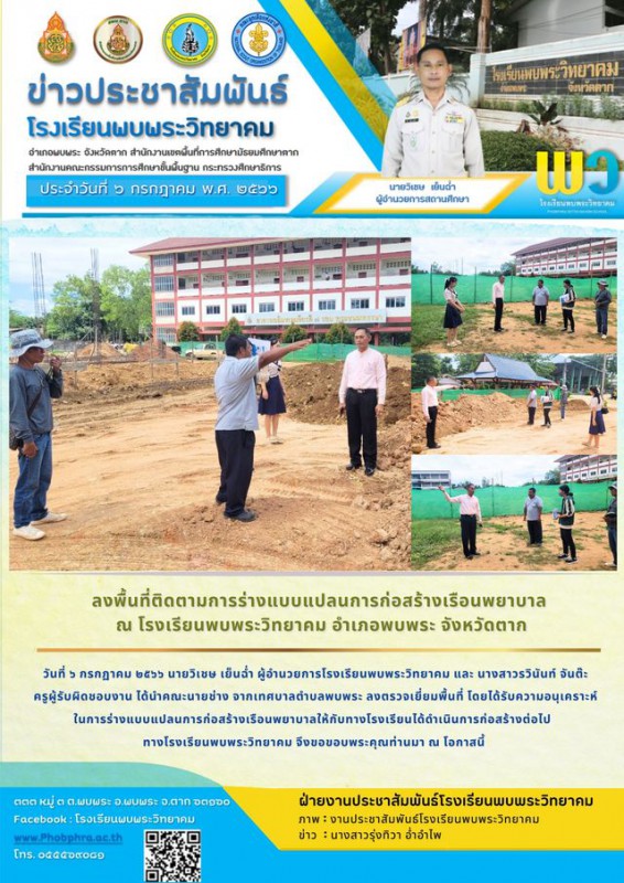 วันที่ ๖ กรกฎาคม ๒๕๖๖ นายวิเชษ เย็นฉ่ำ ผู้อำนวยการโรงเรียนพบพระวิทยาคม และ นางสาวรวินันท์ จันต๊ะ ครูผู้รับผิดชอบงาน ได้นำคณะนายช่าง จากเทศบาลตำบลพบพระ ลงตรวจเยี่ยมพื้นที่ โดยได้รับความอนุเคราะห์ในการร่างแบบแปลนการก่อสร้างเรือนพยาบาลให้กับทางโรงเรียนได้ดำเนินการก่อสร้างต่อไป |