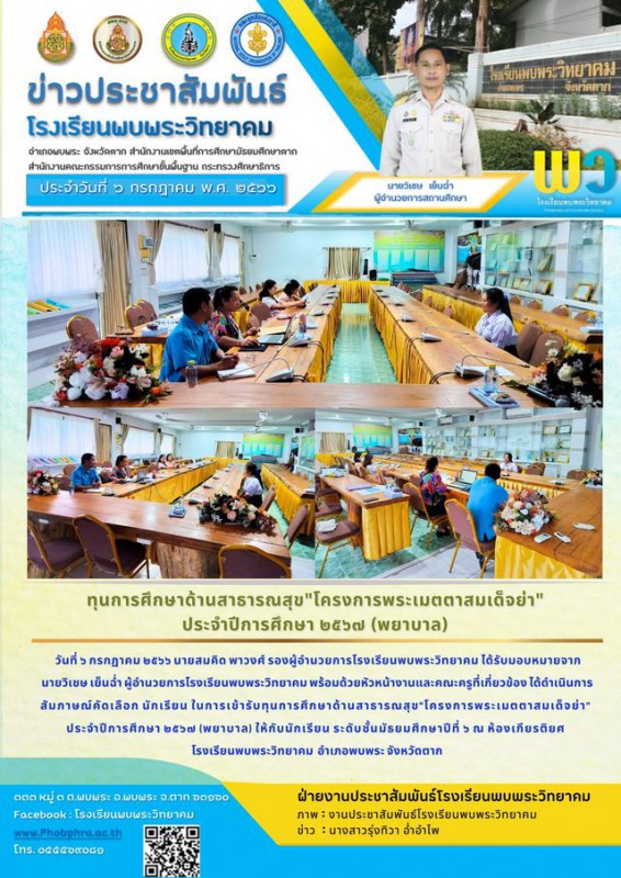 6 กรกฎาคม 2566นายสมคิด พาวงศ์ รองผู้อำนวยการโรงเรียนพบพระวิทยาคม ได้รับมอบหมายจาก นายวิเชษ เย็นฉ่ำ ผู้อำนวยการโรงเรียนพบพระวิทยาคม พร้อมด้วยหัวหน้างานและคณะครูที่เกี่ยวข้อง ได้ดำเนินการสัมภาษณ์คัดเลือ นักเรียนในการเข้ารับทุนการศึกษาด้านสาธารณะสุข "โครงการพระเมตตาสมเด็จย่า" ประจำปีการศึกษา 2566 (พยาบาล) |