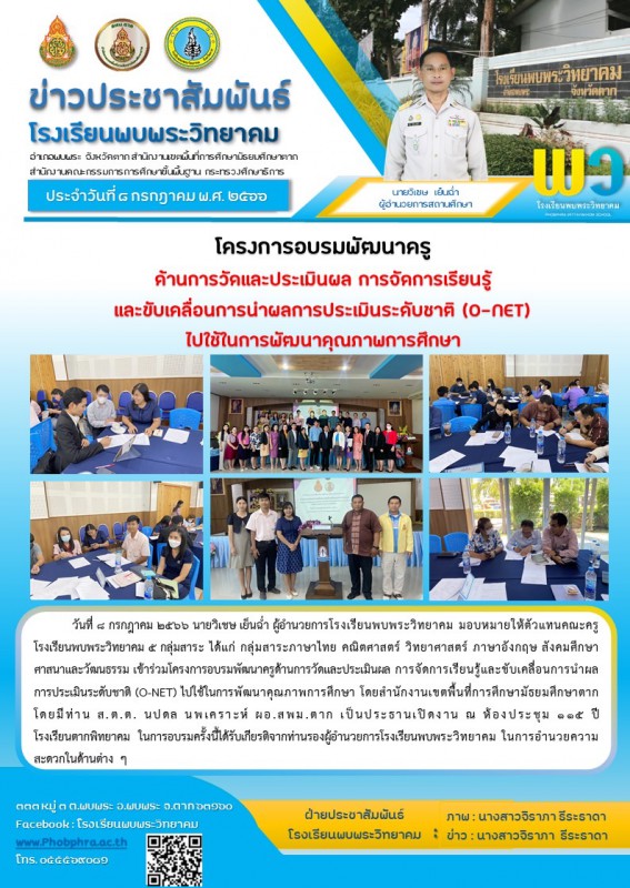 8 กรกฎาคม 2566 นายวิเชษ เย็นฉ่ำ ผู้อำนวยการโรงเรียนพบพระวิทยาคม มอบหมายให้ตัวแทนคณะครู 5 กลุ่มสาระการเรียนรู้ภาษาไทย สังคมศึกษา ศาสนา และวัฒนธรรม คณิตศาสตร์ วิทยาศาสตร์ ภาษาต่างประเทศ เข้าร่วมโครงการอบรมพัฒนาครูด้านการวัดผลและประเมินผล การจัดการเรียนรู้และขับเคลื่อนการนำผลการประเมินระดับชาติ O-NET ไปใช้ในการพัฒนาคุณภาพการศึกษา |