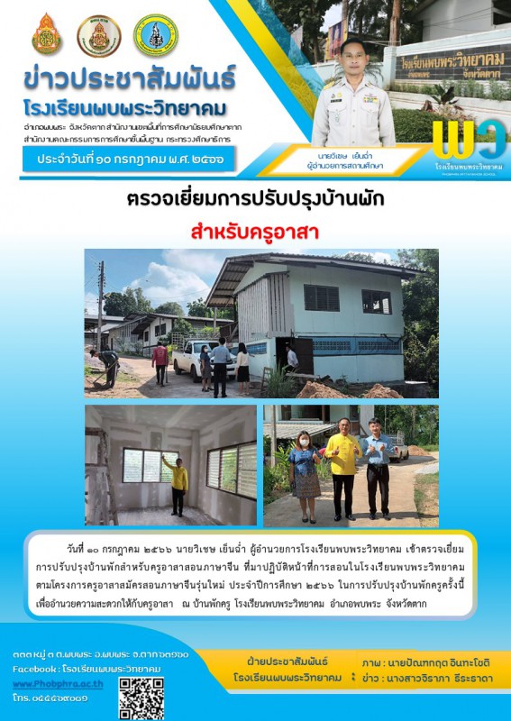 วันที่ 10 กรกฎาคม 2566 นายวิเชษ เย็นฉ่ำ ผู้อำนวยการโรงเรียนพบพระวิทยาคม เข้าตรวจเยี่ยมการปรับปรุงบ้านพักสำหรับครูอาสาสอนภาษาจีน ที่มาปฏิบัติการสอนในโรงเรียน ตามโครงการครูอาสาสมัครสอนภาษาจีนรุ่นใหม่ ประจำปีการศึกษา 2566 |