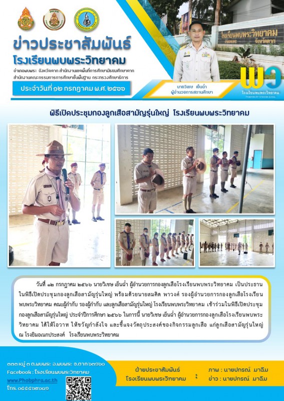 วันที่ 12 กรกฎาคม 2566 นายวิเชษ เย็นฉ่ำ ผู้อำนวยการกองลูกเสือโรงเรียนพบพระวิทยาคม เป็นประธานในพิธีเปิดประชุมกองลูกเสือสามัญรุ่นใหญ่ พร้อมด้วย นายสมคิด พาวงศ์ รองผู้อำนวยการกองลูกเสือโรงเรียนพบพระวิทยาคม คณะผู้กำกับ รองผู้กำกับ และลูกเสือสามัญรุ่นใหญ่ เข้าร่วมในพิธีเปิดประชุมกองลูกเสือสามัญรุ่นใหญ่ ประจำปีการศึกษา 2566 |