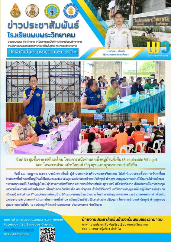 12 กรกฎาคม 2566 นายวิเชษ เย็นฉ่ำ ผู้อำนวยการโรงเรียนพบพระวิทยาคม ได้เข้าร่วมประชุมชี้แจงการขับเคลื่อนโครงการหนึ่งตำบล หฯึ่งหมู่บ้านยั่งยืน (Sustainable Village) และโครงการอำเภอบำบัดทุกข์ บำรุงสุข แบบบูรณาการอย่างยั่งยืน ภายใต้การอำนวยการของ นายสมชัย กิจเจริญรุ่งโรจน์ ผู้ว่าราชการจังหวัดตาก มอบหมายให้ นายทัศนัย สุธาพจน์ ปลัดจังหวัดตาก เป็นประธานในการประชุมครั้งนี้ |