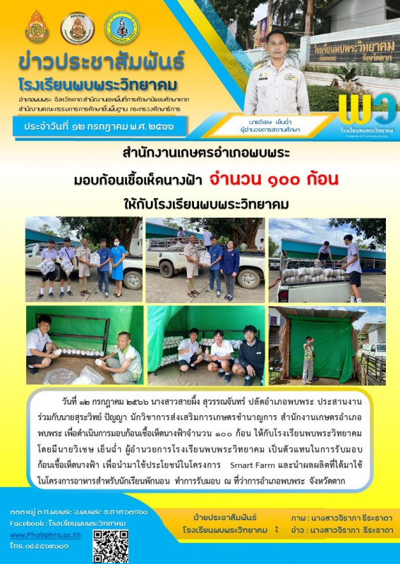 12 กรกฎาคม 2566 นางสาวสายผึ้ง สุวรรณจันทร์ ปลัดอำเภอพบพระ ประสานงานร่วมกับ นายสุระวิทย์ ปัญญา นักวิชาการส่งเสริมการเกษตรชำนาญการ สนง.เกษตร อ.พบพระ เพื่อดำเนินการมอบก้อนเชื้อเห็ดนางฟ้า ให้กับทางโรงเรียนพบพระวิทยาคม |