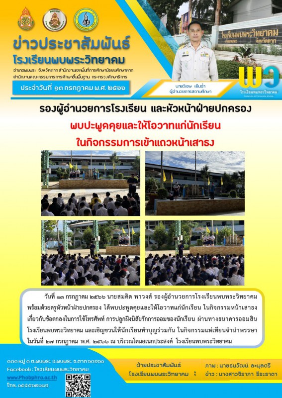13 กรกฎาคม 2566 นายสมคิด พาวงศ์ รองผู้อำนวยการโรงเรียนพบพระวิทยาคม พร้อมด้วยหัวหน้าฝ่ายปกครอง ได้พบปะพูดคุย และให้โอวาทแก่นักเรียน ในกิจกรรมหน้าเสาธง เหี่ยวกับข้อตกลงในการใช้โทรศัพท์เคลื่อนที่ การปลูกฝังนิสัยรักการออม ผ่านทางธนาคารออมสินโรงเรียน และเชิญชวนให้นักเรียนทำบุญร่วมกันในกิจกรรมแห่เทียนจำนำพรรษา ในวันที่ 27กรกฎาคม 2566 |