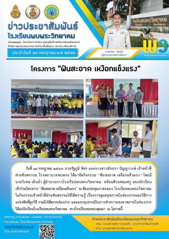 เจ้าหน้าที่ฝ่ายทันตกรรม โรงพยาบาลพบพระ ได้มาจัดกิจกรรม “ฟันสะอาด เหงือกแข็งแรง” โดยมี นายวิเชษ เย็นฉ่ำ ผู้อำนวยการโรงเรียนพบพระวิทยาคม พร้อมด้วยคณะครู และนักเรียน เข้าร่วมโครงการ “ฟันสะอาด เหงือกแข็งแรง” ณ ห้องประชุมกาสลอง โรงเรียนพบพระวิทยาคม อำเภอพบพระ จังหวัดตาก
