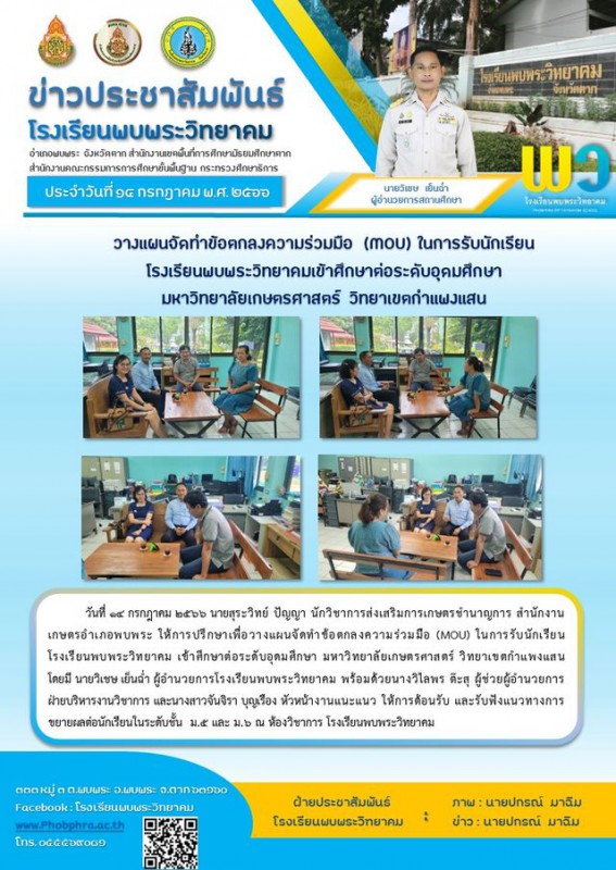 วันที่ 14 กรกฎาคม 2566 นายสุระวิทย์ ปัญญา นักวิชาการส่งเสริมการเกษตรชำนาญการ สำนักงานเกษตรอำเภอพบพระ ให้การปรึกษาเพื่อวางแผนจัดทำข้อตกลงความร่วมมือ (MOU) ในการรับนักเรียนโรงเรียนพบพระวิทยาคมเข้าศึกษาต่อระดับอุดมศึกษา มหาวิทยาลัยเกษตรศาสตร์ วิทยาเขตกำแพงแสน โดยมี นายวิเชษ เย็นฉ่ำ ผู้อำนวยการโรงเรียนพบพระวิทยาคม พร้อมด้วยนางวิไลพร ต๊ะสุ ผู้ช่วยผู้อำนวยการฝ่ายบริหารงานวิชาการ และนางสาวจันจิรา บุญเรือง หัวหน้างานแนะแนว ให้การต้อนรับ และรับฟังแนวทางการขยายผลต่อนักเรียนในระดับชั้น ม.5 และ ม.6 |
