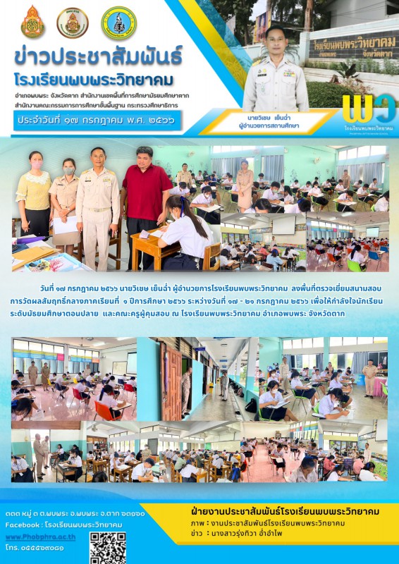 วันที่ 17 กรกฎาคม 2566 นายวิเชษ เย็นฉ่ำ ผู้อำนวยการโรงเรียนพบพระวิทยาคม พร้อมด้วย นายสมคิด พาวงศ์ รองผู้อำนวยการโรงเรียนพบพระวิทยาคม ลงพื้นที่ตรวจเยี่ยมสนามสอบการวัดผลสัมฤทธิ์กลางภาคเรียนที่ 1 ปีการศึกษา 2566 ระหว่างวันที่ 17-21กรกฎาคม 2566 เพื่อให้กำลังใจนักเรียน และคณะครูผู้คุมสอบ |