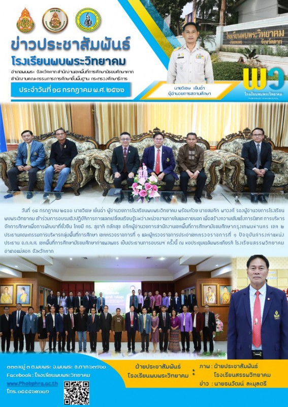 วันที่ 18 กรกฎาคม 2566 นายวิเชษ เย็นฉ่ำ ผู้อำนวยการโรงเรียนพบพระวิทยาคม พร้อมด้วย นายสมคิด พาวงศ์ รองผู้อำนวยการโรงเรียนพบพระวิทยาคม เข้าร่วมการอบรมเชิงปฏิบัติการการแลกเปลี่ยนเรียนรู้ระหว่างหน่วยงานภายในและภายนอก เพื่อสร้างความเข้มแข็งการนิเทศ การบริหารจัดการศึกษาเพื่อการพัฒนาที่ยั่งยืน โดยมี ดร. สุชาติ กลัดสุข อดีตผู้อำนวยการสำนักงานเขตพื้นที่การศึกษามัธยมศึกษากรุงเทพมหานคร เขต 2 ประธานคณะกรรมการบริหารกลุ่มพื้นที่การศึกษา เขตตรวจราชการที่ 1 และผู้ตรวจราชการประจำเขตตรวจราชการที่ 1 ปัจจุบันดำรงตำแหน่ง ประธาน อ.ก.ค.ศ. เขตพื้นที่การศึกษามัธยมศึกษากำแพงเพชร เป็นประธานการอบรมฯ ครั้งนี้ ณ หอประชุมเฉลิมพระเกียรติ โรงเรียนสรรพวิทยาคม อ.แม่สอด จ.ตาก |