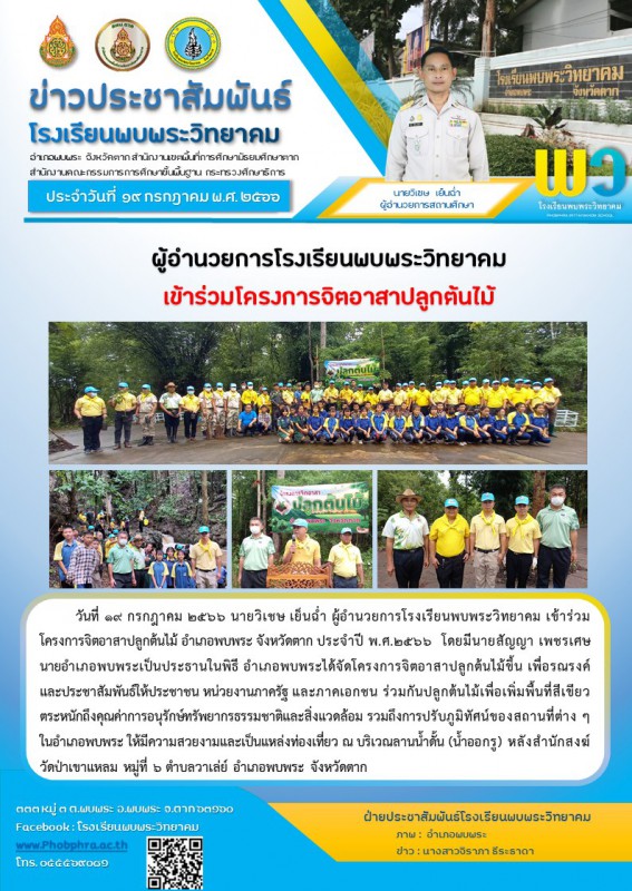 วันที่ 19 กรกฎาคม 2566 นายวิเชษ เย็นฉ่ำ ผู้อำนวยการโรงเรียนพบพระวิทยาคม เข้าร่วมโครงการจิตอาสาปลูกต้นไม้ อำเภอพบพระ จังหวัดตากประจำปี พ.ศ.2566 โดยมี นายสัญญา เพชรเศษ นายอำเภอพบพระเป็นประธานในพิธี อำเภอพบพระ ได้จัดทำโครงการจิตอาสาปลูกต้นไม้ขึ้นเพื่อรณรงค์ประชาสัมพันธ์ให้ประชาชน หน่วยงานภาครัฐ และภาคเอกชนร่วมปลูกต้นไม้และตระหนักถึงคุณค่าการอนุรักษ์ทรัพยากรธรรมชาติและสิ่งแวดล้อม ปรับภูมิทัศน์ของสถานที่ต่างของอำเภอพบพระ ให้มีความสวยงามและเป็นแหล่งท่องเที่ยว รวมทั้งเพิ่มพื้นที่สีเขียวให้กับอำเภอพบพระ