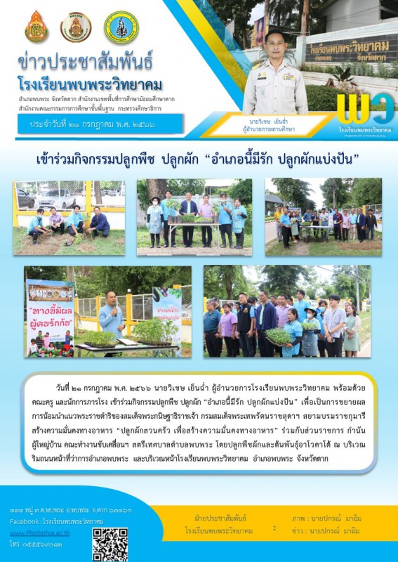 21 กรกฎาคม 2566 นายวิเชษ เย็นฉ่ำ ผู้อำนวยการโรงเรียนพบพระวิทยาคม นายสมคิด พาวงศ์ รองผู้อำนวยการโรงเรียนพบพระวิทยาคม พร้อมด้วยคณะครูและบุคลากรทางการศึกษา เข้าร่วมกิจกรรมปลูกพืช ปลูกผัก "อำเภอนี้มีรัก ปลูกผักแบ่งกัน" |