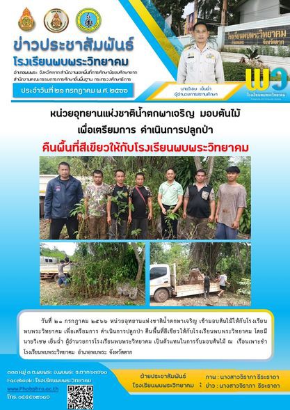 วันที่ 21 กรกฎาคม 2566 หน่วยอุทยานแห่งชาตินำตกพาเจริญ เข้ามอบต้นไม้ให้ทางโรงเรียน เพื่อเตรียมการดำเนินการปลูกป่า เพื่อคืนพื้นที่สีเขียวให้กับทางโรงเรียน โดยมี นายวิเชษ เย็นฉ่ำ ผู้อำนวยการโรงเรียนพบพระวิทยาคม เป็นตัวแทนในการรับมอบต้นไม้ |