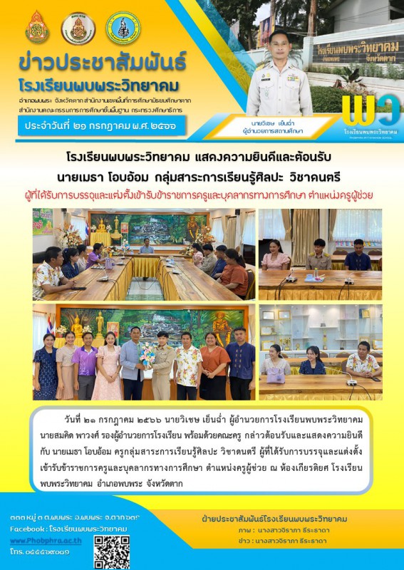 ๒๑ กรกฎาคม ๒๕๖๖ นายวิเชษ เย็นฉ่ำ ผู้อำนวยการโรงเรียนพบพระวิทยาคม นายสมคิด พาวงศ์ รองผู้อำนวยการโรงเรียนพบพระวิทยาคม พร้อมด้วยคณะครู กล่าวต้อนรับและแสดงความยินดีกับ นายเมธา โอบอ้อม ครูกลุ่มสาระการเรียนรู้ศิลปะ วิชาดนตรี ผู้ที่ได้รับการบรรจุแต่งตั้งเข้ารับราชการ ตำแหน่งครูผู้ช่วย |