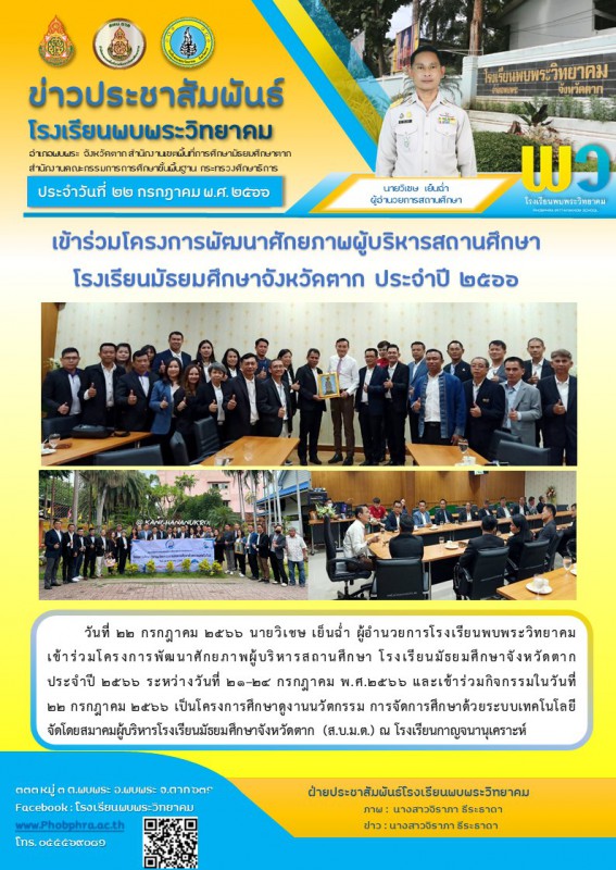 22 กรกฎาคม 2566 นายวิเชษ เย็นฉ่ำ ผู้อำนวยการโรงเรียนพบพระวิทยาคม เข้าร่วมโครงการพัฒนาศักยภาพผู้บริหารสถานศึกษา โรงเรียนมัธยมศึกษาจังหวัดตาก ประจำปี 2566 |
