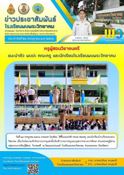 วันที่ 24 กรกฎาคม 2566 นายเมธา โอบอ้อม ได้ขึ้นแนะนำตัว พบปะ คณะครู และนักเรียนโรงเรียนพบพระวิทยาคม เนื่องในโอกาสเข้ารับการบรรจุแต่งตั้งเป็นข้าราชการครูและบุคลากรทางการศึกษา ตำแหน่งครูผู้ช่วย กลุ่มสาระการเรียนรู้ศิลปะ วิชาดนตรี |