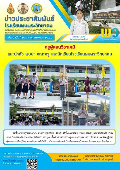วันที่ 25 กรกฎาคม 2566 นางสาวสุนทรียา จินะอิ ได้ขึ้นแนะนำตัว พบปะ คณะครู และนักเรียนโรงเรียนพบพระวิทยาคม เนื่องในโอกาสเข้ารับการบรรจุแต่งตั้งเป็นข้าราชการครูและบุคลากรทางการศึกษา ตำแหน่งครูผู้ช่วย กลุ่มสาระการเรียนรู้วิทยาศาสตร์และเทคโนโลยี วิชาเคมี |