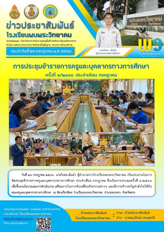 วันที่ 26 กรกฎาคม 2566 นายวิเชษ เย็นฉ่ำ ผู้อำนวยการโรงเรียนพบพระวิทยาคม เป็นประธานในการจัดประชุมข้าราชการครูและบุคลากรทางการศึกษา ประจำเดือน กรกฎาคม ซึ่งเป็นการประชุมครั้งที่ 6/2566 เพื่อชี้แจงนโยบายและการดำเนินงาน เตรียมการในการขับเคลื่อนกิจกรรมต่างๆ และมีการสร้างขวัญกำลังใจให้กับคณะครูและบุคลากรทางการศึกษา |