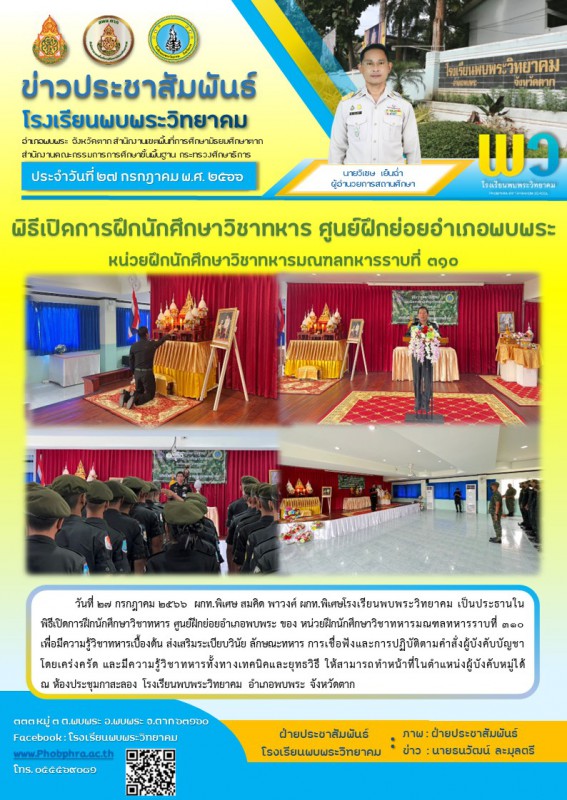วันที่ 27 กรกฎาคม 2566 ผกท.พิเศษ สมคิด พาวงศ์ ผกท.พิเศษโรงเรียนพบพระวิทยาคม เป็นประธานในพิธีเปิดการฝึกนักศึกษาวิชาทหาร ศูนย์ฝึกย่อยอำเภอพบพระ ของ หน่วยฝึกนักศึกษาวิชาทหารมณฑลทหารราบที่ ๓๑๐ เพื่อมีความรู้วิชาทหารเบื้องต้น ส่งเสริมระเบียบวินัย ลักษณะทหาร การเชื่อฟังและการปฏิบัติตามคำสั่งผู้บังคับบัญชาโดยเคร่งครัด และมีความรู้วิชาทหารทั้งทางเทคนิคและยุทธวิธี ให้สามารถทำหน้าที่ในตำแหน่งผู้บังคับหมู่ได้ |