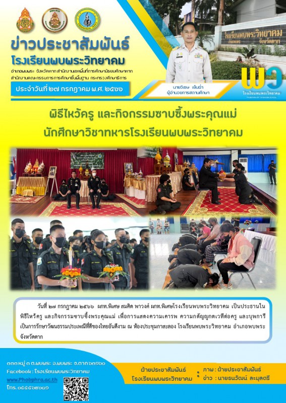 วันที่ 27 กรกฎาคม 2566 ผกท.พิเศษ สมคิด พาวงศ์ ผกท.พิเศษโรงเรียนพบพระวิทยาคม เป็นประธานในพิธีไหว้ครู และกิจกรรมซาบซึ้งพระคุณแม่ เพื่อการแสดงความเคารพ ความกตัญญูกตเวทีต่อครู และบุพการี เป็นการรักษาวัฒนธรรมประเพณีที่ดีของไทยอันดีงาม |