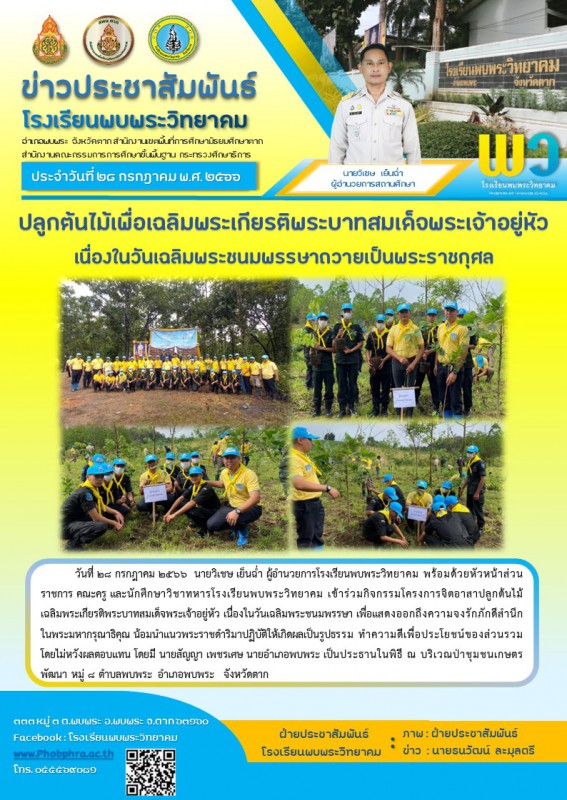 วันที่ 28 กรกฎาคม 2566 นายวิเชษ เย็นฉ่ำ ผู้อำนวยการโรงเรียนพบพระวิทยาคม พร้อมด้วยหัวหน้าส่วนราชการ คณะครู และนักศึกษาวิชาทหารโรงเรียนพบพระวิทยาคม เข้าร่วมกิจกรรมโครงการจิตอาสาปลูกต้นไม้เฉลิมพระเกียรติพระบาทสมเด็จพระเจ้าอยู่หัว เนื่องในวันเฉลิมพระชนมพรรษา เพื่อแสดงออกถึงความจงรักภักดีสำนึกในพระมหากรุณาธิคุณ น้อมนำแนวพระราชดำริมาปฏิบัติให้เกิดผลเป็นรูปธรรม ทำความดีเพื่อประโยชน์ของส่วนรวม โดยไม่หวังผลตอบแทน โดยมี นายสัญญา เพชรเศษ นายอำเภอพบพระ เป็นประธานในพิธี ณ บริเวณป่าชุมชนเกษตรพัฒนา หมู่ 8 ตำบลพบพระ อำเภอพบพระ จังหวัดตาก |