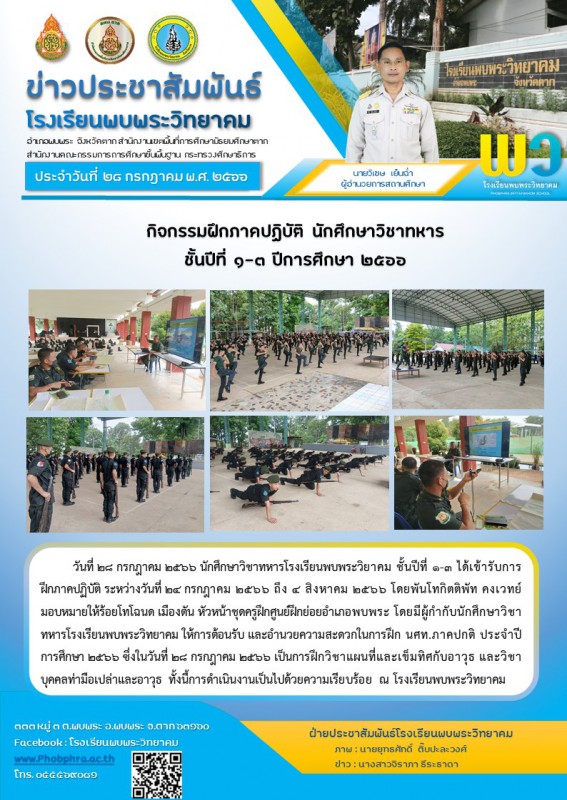 ๒๘ กรกฎาคม ๒๕๖๖ นักศึกษาวิชาทหารโรงเรียนพบพระวิยาคม ชั้นปีที่ ๑-๓ ได้เข้ารับการฝึกภาคปฏิบัติ ระหว่างวันที่ ๒๔ กรกฎาคม ๒๕๖๖ ถึง ๔ สิงหาคม ๒๕๖๖ โดยพันโทกิตติพัท คงเวทย์ มอบหมายให้ร้อยโทโฉนด เมืองตัน หัวหน้าชุดครูฝึกศูนย์ฝึกย่อยอำเภอพบพระ โดยมีผู้กำกับนักศึกษาวิชาทหารโรงเรียนพบพระวิทยาคม ให้การต้อนรับ และอำนวยความสะดวกในการฝึก นศท.ภาคปกติ ประจำปีการศึกษา ๒๕๖๖ ซึ่งในวันที่ ๒๘ กรกฎาคม ๒๕๖๖ เป็นการฝึกวิชาแผนที่และเข็มทิศกับอาวุธ และวิชาบุคคลท่ามือเปล่าและอาวุธ ทั้งนี้การดำเนินงานเป็นไปด้วยความเรียบร้อย |