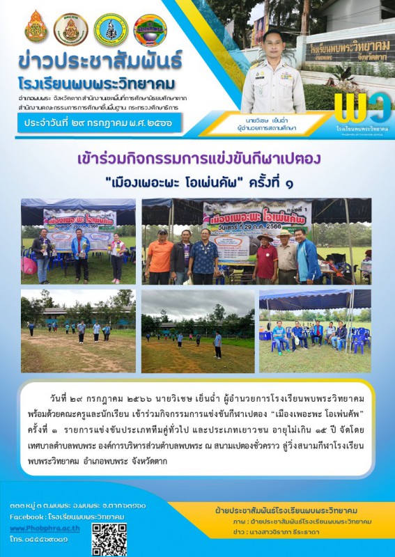 วันที่ 29 กรกฎาคม 2566 นายวิเชษ เย็นฉ่ำ ผู้อำนวยการโรงเรียนพบพระวิทยาคม นายสมคิด พาวงศ์ รองผู้อำนวยการโรงเรียน พร้อมด้วยคณะครู และนักเรียน เข้าร่วมกิจกรรมการแข่งขันเปตอง "เมืองเพอะพะ โอเพ่นคัพ" ครั้งที่ 1 จัดโดย เทศบาลตำบลพบพระ องค์การบริหารส่วนตำบลพบพระ ณ สนามเปตองชั่วคราว ลู่วิงสนามกีฬาโรงเรียนพบพระวิทยาคม |