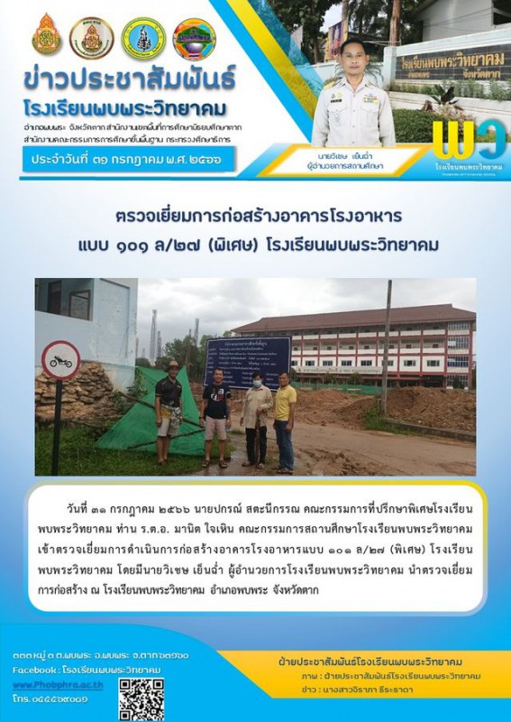 วันที่ ๓๑ กรกฎาคม ๒๕๖๖ นายปกรณ์ สตะนีกรรณ คณะกรรมการที่ปรึกษาพิเศษโรงเรียนพบพระวิทยาคม ท่าน ร.ต.อ. มานิต ใจเหิน คณะกรรมการสถานศึกษาโรงเรียนพบพระวิทยาคม เข้าตรวจเยี่ยมการดำเนินการก่อสร้างอาคารโรงอาหารแบบ ๑๐๑ ล/๒๗ (พิเศษ) โรงเรียนพบพระวิทยาคม โดยมีนายวิเชษ เย็นฉ่ำ ผู้อำนวยการโรงเรียนพบพระวิทยาคม นำตรวจเยี่ยม การก่อสร้าง ณ โรงเรียนพบพระวิทยาคม อำเภอพบพระ จังหวัดตาก |